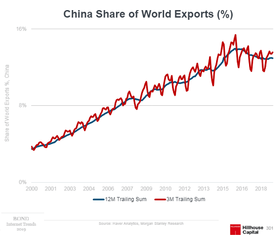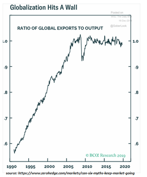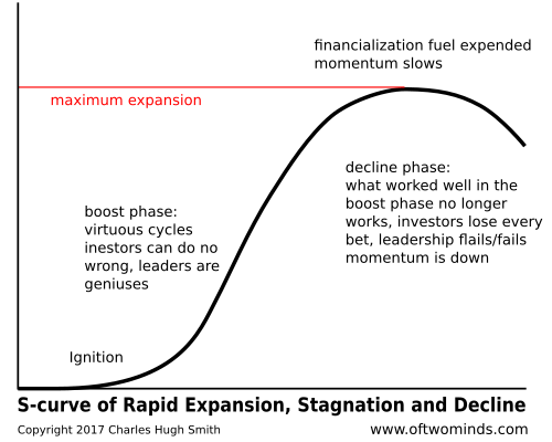 Individual decisions add up to trend changes, and these charts reflect a trend change in globalization and China’s share of global exports. Globalization and China’s share of global exports have both plateaued and are now entering the stagnation / decline phase of the S-Curve.