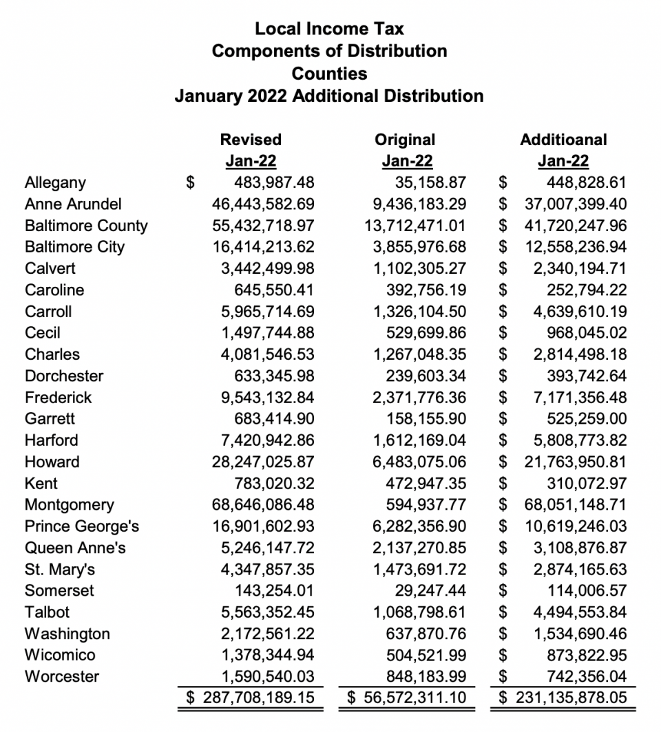 The Maryland Comptroller today announced that counties will receive $231 million in a special income tax distribution related to administrative complexities for pass-through entities in tax year 2020.