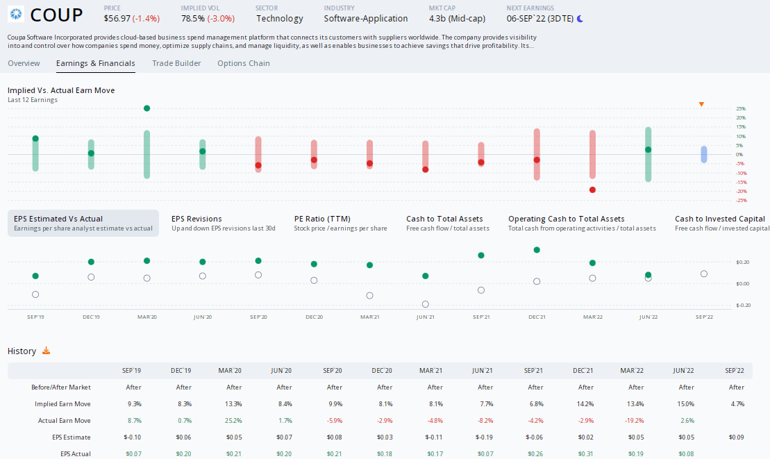 Digging into Tuesday’s earnings expectations, data from Option Research & Technology Services (ORATS) show that Coupa has beaten earnings expectations in each of the last 12 quarters. Even with a stunning beat rate history, shares have traded lower post-earnings in seven of the past eight instances.
