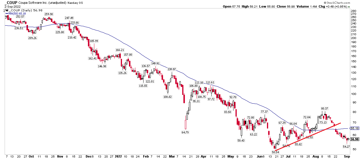 With an expensive stock and cheap options ahead of the Q3 report, what does the chart suggest? COUP shares appear to be bottoming out in the $50s, but the onus is on the bulls to reverse a downtrend that began way back in the first quarter of 2021. After plummeting through $200 support late last year, there were few buyers until the stock hit $65 back in March. The last few months have been choppy.