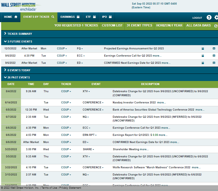 Coupa’s corporate event calendar shows a Q3 2023 confirmed earnings date of Tuesday, September 6 AMC, according to Wall Street Horizon. An earnings call immediately follows the release. You can listen live here.