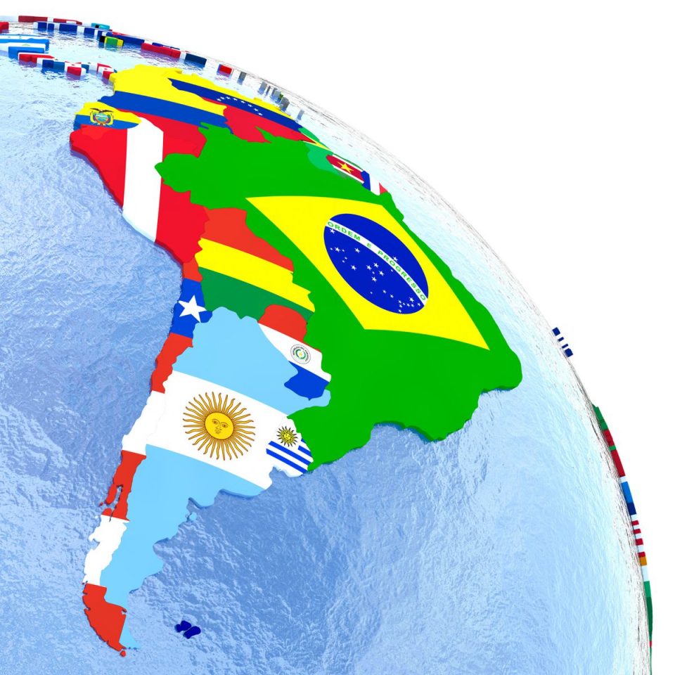South America on political globe with national flags embedded in map. 3D illustration. 3D model of … [+]