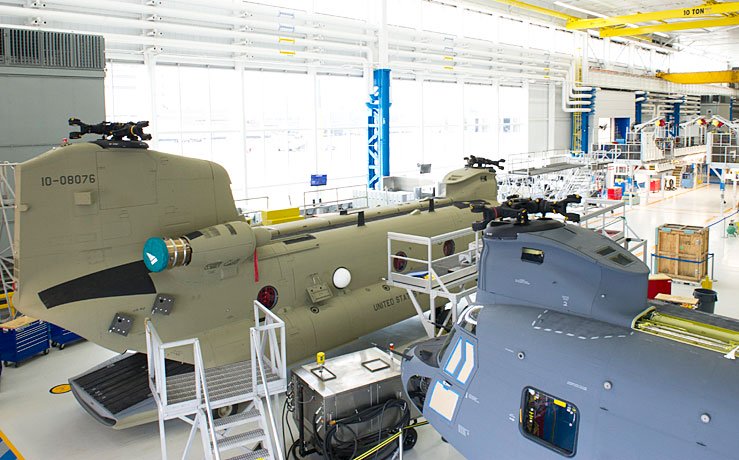The factory is a major hub of military rotorcraft manufacturing where Boeing builds the H-47 Chinook for the U.S. Army and international customers. The company builds the fuselage and performs post-combat refit for the V-22 Osprey there. Boeing also installs military specific equipment and finalizes assembly of the Air Force’s new MH-139 Grey Wolf, built across town by Leonardo Helicopters.