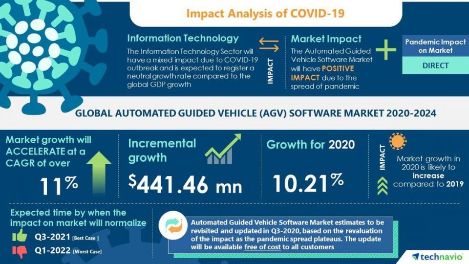 The automated guided vehicle (AGV) software market is expected to grow by USD 441.46 million during 2020-2024. The report also provides the market impact and new opportunities created due to the COVID-19 pandemic. We expect the impact to be significant in the first quarter but gradually lessen in subsequent quarters – with a limited impact on the full-year economic growth.