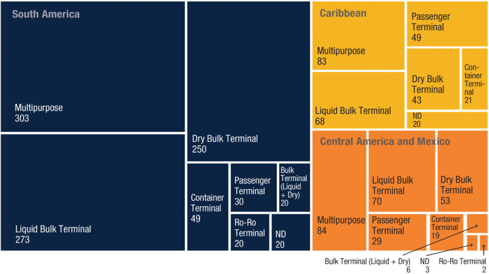 On the other side of the picture, 15 countries or territories have five or fewer port facilities each – Antiqua and Barbuda, Bermuda, Belize, Barbados, Turks and Caicos Islands, El Salvador, Aruba, Bonaire, Cayman Islands, Dominica, Anguilla, Montserrat, Sint Eustatius, Saint Barth and Sint Maarten.