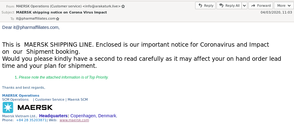 Above, an example of one malicious email thread which has been circulating through the network of global shipping giant Maersk (Nettitude)