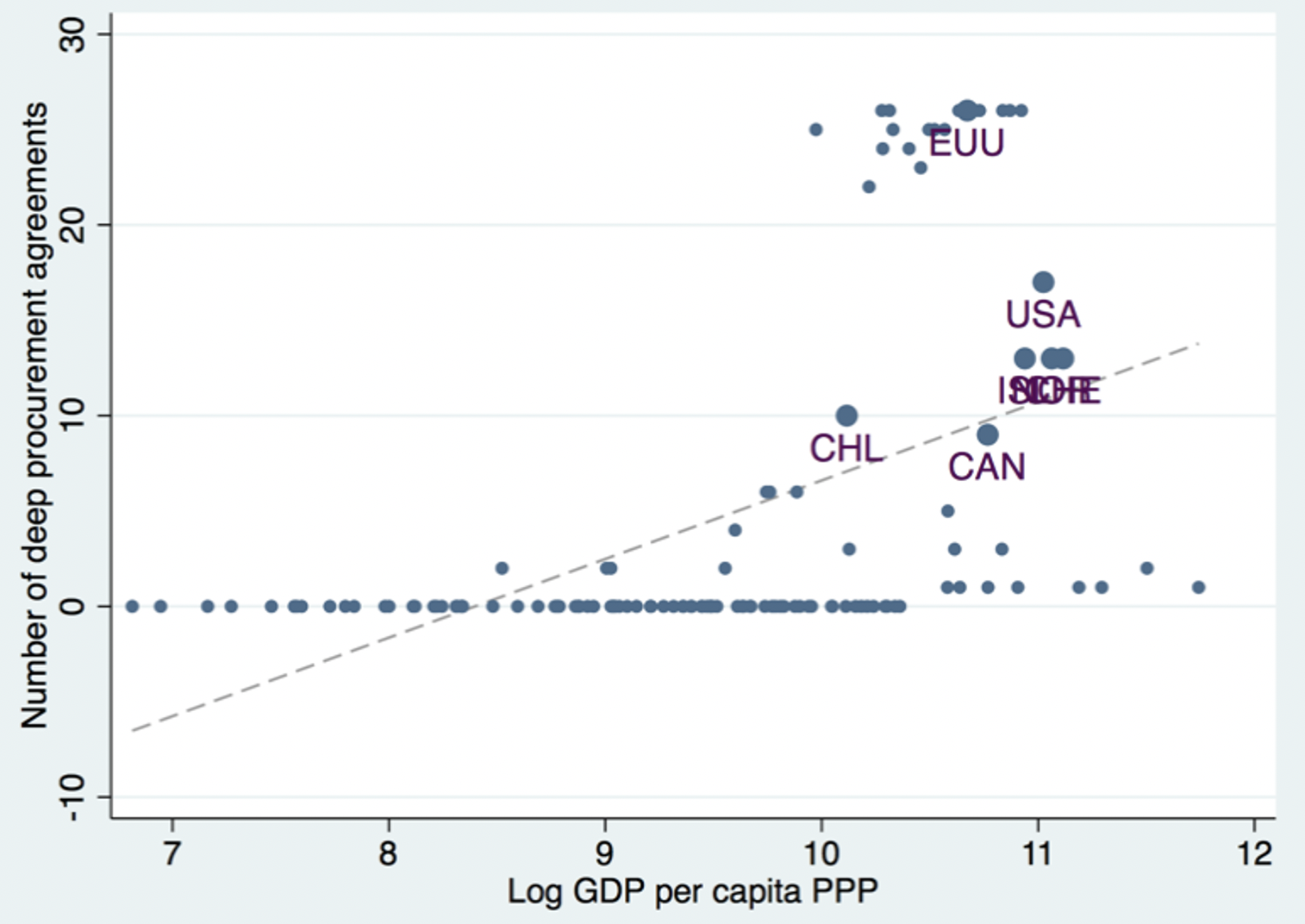 Cross-country information on attributes of pre-crisis national public procurement regimes is sourced from the World Bank and includes indicators of the number of steps involved in public procurement, the use of e-procurement, and average time taken to award contracts. Data on participation and coverage of public procurement in deep trade agreements is obtained from Shingal and Ereshchenko (2020). Public procurement processes in richer countries tend to be more efficient, involve fewer steps and take less time to complete on average (Figure 2, top panel). Richer countries also tend to be members of the GPA and to have signed more deep procurement agreements (Figure 2, bottom panel). Most developing countries have not signed the GPA or concluded trade agreements that include public procurement commitments.