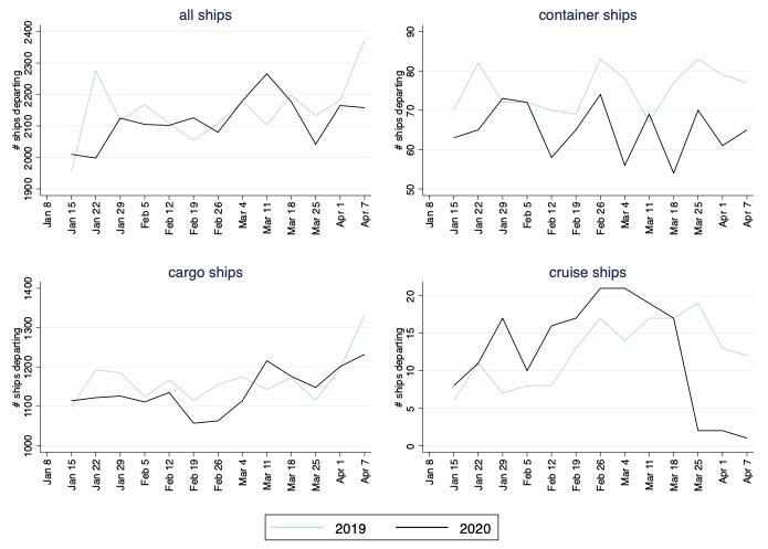 In mid-April, after a few weeks of global lockdown, the cruise industry stands out with a dramatic fall, but sea transportation of cargo has also been substantially hit. The departure of all ships in the first week of April 2020 was down 20% compared to 2019, while the decrease in container-ship departures was 29%.