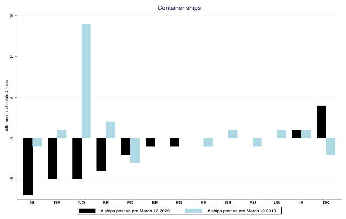 To establish causality and filter out trends in shipping unrelated to the COVID-19 crisis, we conduct a difference-in-difference estimation. Comparing the change in the number of departures in the five weeks prior to and five weeks after 12 March across the years 2020, 2019, and 2018, we find that in 2020 the number of ships dropped by 6% compared to the change observed in previous years. For container ships, the difference is -8%; for cargo ships, the drop is 3%. Tanker traffic, which also suffers from the concurrent turbulences in the oil market, is down 16%.