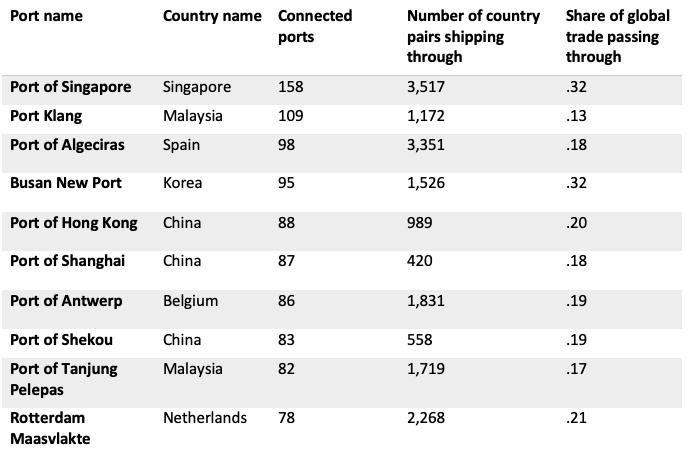 Table 1 provides an overview of the ten most central ports in the world. Column 4 shows that for 3,517 trade relationships (a pair of one exporter and one importer located anywhere on the globe) the fastest connection within the network of active shipping routes passes through the Port of Singapore. Trade between these countries accounts for 32% of global trade (Column 5).