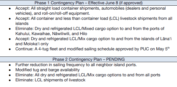 In May, the company, which operates eight multipurpose barges and six tugs and has a staff of about 130, began cutting costs by reducing its weekly sailing schedules among Maui, Kahului and Hilo for a savings of $6 million. It has also reduced gate hours at its barge terminals, instituted a hiring freeze and reduced executive salaries.