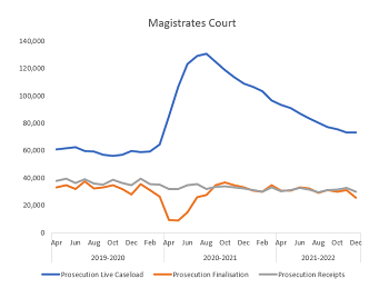 The magistrates’ court live caseload was falling at an average rate of 11.5% over the last year, however this quarter the rate has reduced to 5%, from 76,990 in Q2 21/22 to 73,106 in Q3 21/22.