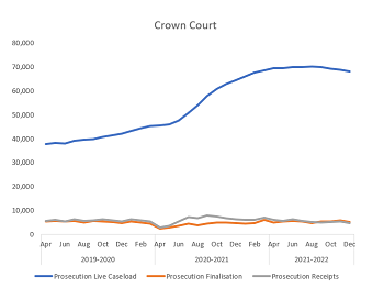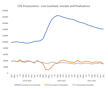 This is due to reductions in the magistrates’ court, as conversely prosecutions are showing an increase in the Crown Court of 6.9% from 15,188 in Q2 21/22 to 16,235 in Q3 21/22.