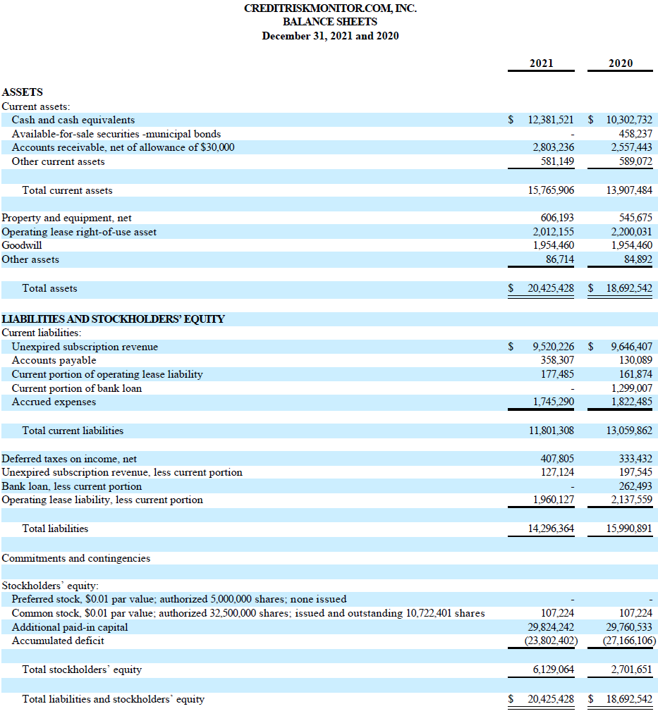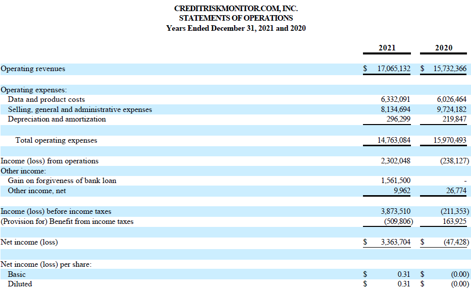 VALLEY COTTAGE, NY / ACCESSWIRE / March 25, 2022 / CreditRiskMonitor (OTCQX:CRMZ) reported that operating revenues for the year ended December 31, 2021 increased to approximately $17 million up 8.5% from $15.7 million in 2020. The Company reported a pre-tax operating income of approximately $2.3 million in 2021 compared to a pre-tax operating loss of approximately $238 thousand in 2020. In 2021 approximately $1.6 million in non-taxable income was recognized due to the forgiveness of the Company’s PPP loan by the Small Business Administration in December 2021. Net income for 2021, including that recognized from the loan forgiveness, was approximately $3.4 million compared to a net loss of approximately $47 thousand for 2020.