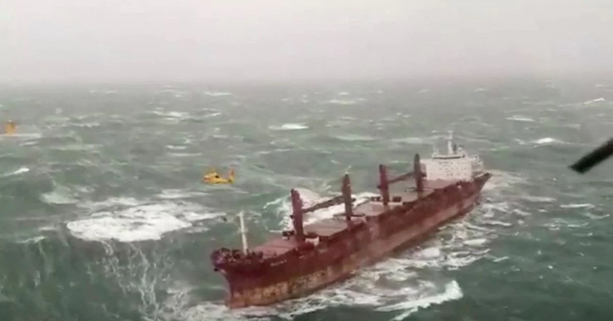 After an hour-long rescue operation with helicopters, the coastguard reported that all 18 crew members were taken off the vessel.