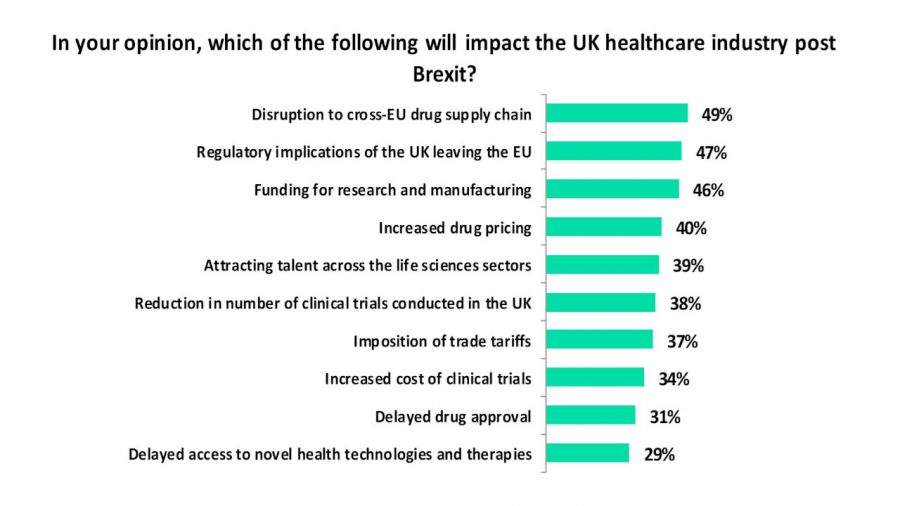 Increased cost of clinical trials, delayed drug approval, and delayed access to novel health technologies and therapies are the other areas of the UK healthcare industry to be most affected by Brexit, as voted respectively by 34%, 31% and 29% of the respondents.