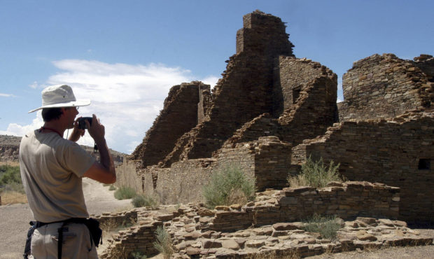 FILE – In this Aug. 10, 2005 file photo, tourist Chris Farthing from Suffolks County, England, takes a picture of Anasazi ruins in Chaco Culture National Historical Park in New Mexico. The preservation and protection of Native American cultural sites would be a priority of U.S. land managers under one of the options up for consideration as they work to amend an outdated guide for management of oil and gas drilling across a sprawling area of northwestern New Mexico. (AP Photo/Jeff Geissler, File)