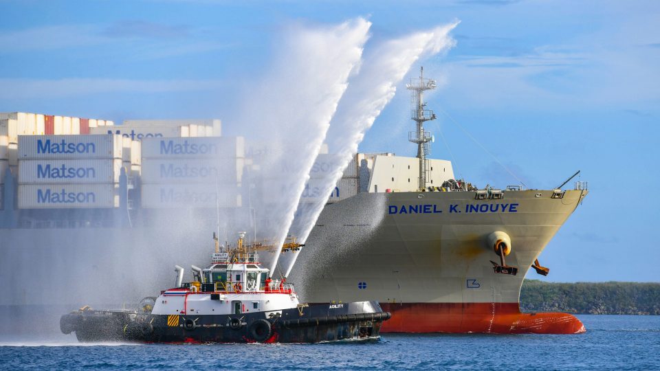 Matson’s Daniel K. Inouye containership pulls in to the Port Authority of Guam during its inaugural voyage as it begins service to the island and the region on July 14, 2020.