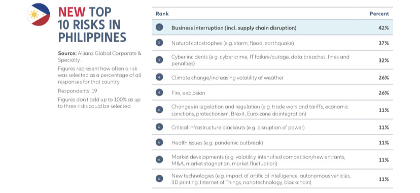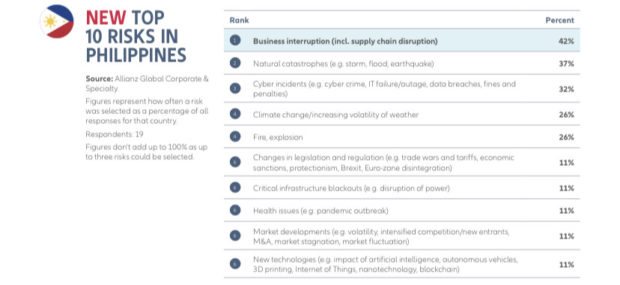 These are top three risks to businesses in the Philippines cited by local organizations, according the Allianz Risk Barometer: Identifying the Major Business Risks for 2020 report published by global corporate insurance carrier Allianz Global Corporate & Specialty (AGCS).