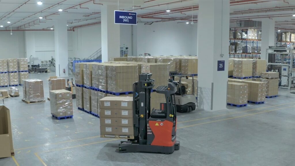 Incoming freight is processed through a ball deck, which increases speed and eases handling. Pallet lifters then move freight to the automated warehouse with Very Narrow Aisles (VNA) to optimize capacity. The multi-shuttle and carton live storage systems are complemented by Goods-to-Person (GTP) and Pick-To-Light technologies, conveyor systems, and Automated Guided Vehicles (AGVs).