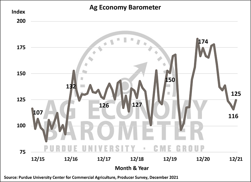 The Purdue University/CME Group Ag Economy Barometer rose for only the second time since May, up nine points to a reading of 125 in December. The Index of Current Conditions and the Index of Future Expectations also rose this month with a stronger current conditions index primarily responsible for the barometer’s rise. The December’s Index of Current Conditions rose 18 points to a reading of 146, while the Index of Future Expectations rose four points to a reading of 114.