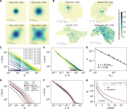 In Fig. 3B, we see that Docc is the most determinant factor to decrease the average distance to a facility independent of its type and city. In Fig. 3C, we observe that these decreasing functions L(Docc) collapse for the optimal distributions in each city. Following up on this observation, we explore further the relation between travel distance in optimal scenario L and the number of facilities N for diverse cities with various geographic constraints and population distributions. To this end, we designed 17 toy cities with different levels of urban centrality; 4 of these are illustrated in Fig. 5A. Population distributions of the toy cities are generated by a two-dimensional Gaussian function (e.g., cities a and b) or a mixture of several two-dimensional Gaussian functions (e.g., cities c and d). The toy cities have the same population of half million and are equal sized, consisting of 100 × 100 blocks. The size of each block is set to 1 km2, and the travel cost between two blocks is calculated with the Euclidean distance between their centroids. We measure the centrality of a city by computing the urban centrality index (UCI), proposed by Pereira et al. (54), of the population distribution (Materials and Methods). UCI ranges from 0 to 1, with 0 indicating the totally polycentric—with the population of the city uniformly distributed—and 1 indicating totally monocentric—with all the population residing in one block. In addition, we include 12 real-world cities for further exploration, the six aforementioned to which we add: Paris, Barcelona, London, Dublin, Mexico City, and Melbourne. Population distributions of four selected cities are illustrated in Fig. 5B. Paris is the most monocentric, with a UCI of 0.50 and most residents residing in the urban region, while Melbourne is the most polycentric, with a UCI of 0.08 and residents dispersed over the city.