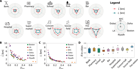 Thereafter, we compare the difference in accessibility across cities to various facility types. Figure 3A presents the average travel distances in the actual scenario () and optimal scenario (L) to the 10 selected types of amenities. The first row displays the facilities with higher densities in the United States cities: banks, pharmacies, schools, parks, and bars. Next come hospitals and supermarkets, followed by concert halls, soccer fields, and fire stations, which have the lowest densities. As expected, the lower the density, the longer the travel distance there is to them. Note that the accessibilities to parks, fire stations, and bars have the largest differences between the United States and GCC cities mainly due to lower availability in the latter. To compare the travel distance in different cities in the same order, we exhibit the scatterplots of and L versus Docc, the ratio between N and Nocc, in Fig. 3 (B and C). The discrepancy of actual travel distance among the six cities is mainly caused by the difference in facility planning strategy and urban form. As expected, the optimal travel distance L displays a more uniform tendency than , revealing the potential of modeling L with the number of facilities N.