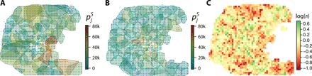 (A) Service communities of the hospitals, as measured from empirical data in Boston. The dots refer to the blocks in the city. The color indicates the population in each community. (B) Service communities of the optimally distributed hospitals in Boston. In this optimal scenario, both of the area and the population of communities are generally more equable than those in the actual scenario. (C) The block gain index ri in logarithmic scale in Boston. The blocks in green indicate that the residents are better served in reality; ri does not have units. The blocks in red indicate that their actual travel distance to the hospital is larger than the optimal distance and they are underserved, such as in the northern and southeastern areas.