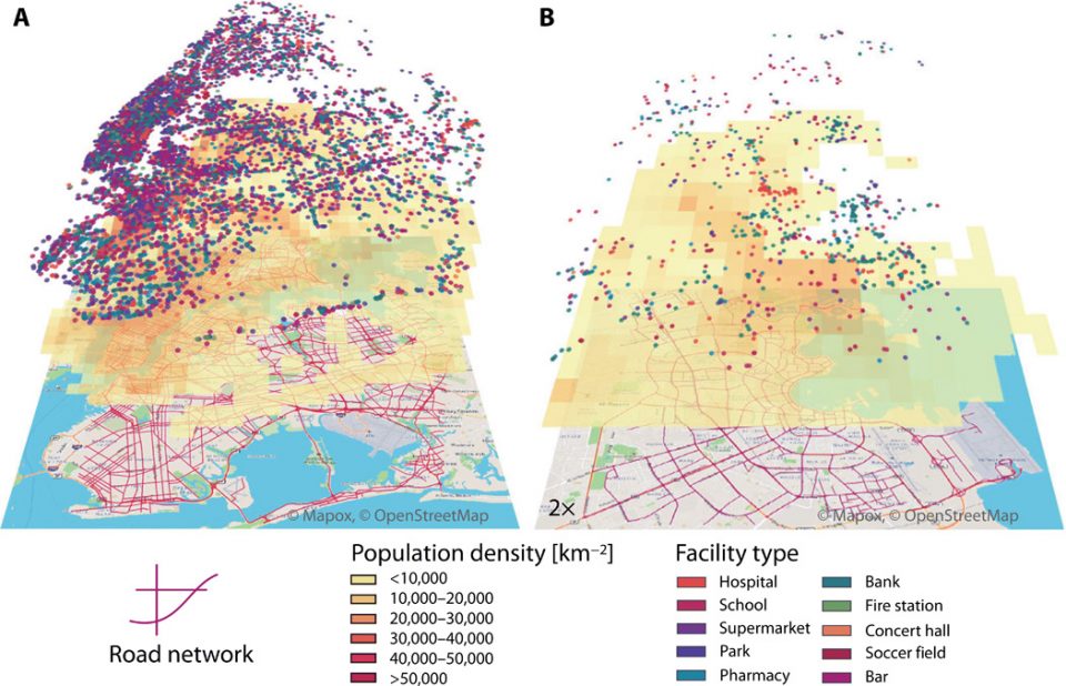 At a time of the very visible effects of the climate impact on our urban lives, some cities have become unbreathable, and greenhouse gas emissions are produced by buildings heating and cooling networks and all-round petrol transport. At a time when transport has become the first emitter of CO2, we need to imagine, propose, other ways of occupying urban space. This calls for a better understanding of the spatial distributions of facilities and population (1–7). The information age and the online mapping revolution allow us to globally study the interactions of humans with their built and natural environment (8–13). Pioneering work in multicity studies has uncovered scaling laws relating population to distribution of facilities and socioeconomic activities at macroscopic scale (3, 6, 14–16). It has been asserted, for example, that more populated cities are more efficient in their per capita consumption (3, 4), and their occupation diversity can be modeled as social networks embedded in space (10). However, a systematic understanding of the interplay of the urban form, their facilities distribution, and their accessibility at multiple scales remains an elusive task.