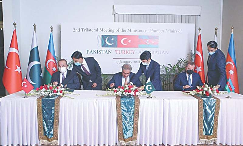 Foreign Ministers Shah Mehmood Qureshi, Mevlut Cavusoglu and Jeyhun Bayramov reached the agreement during the second round of trilateral talks held here.