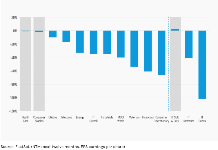 High quality companies are by their nature less exposed to potential adverse events, as demonstrated by our strategy’s history of relative outperformance in down markets. Even more interesting perhaps is a closer look at the sustainability of earnings across different sectors during the last financial crisis. Earnings of software and services companies were up 2% over 18 months, against a 40% fall for the MSCI World Index, while health care and consumer staples were only down marginally (Display 1).