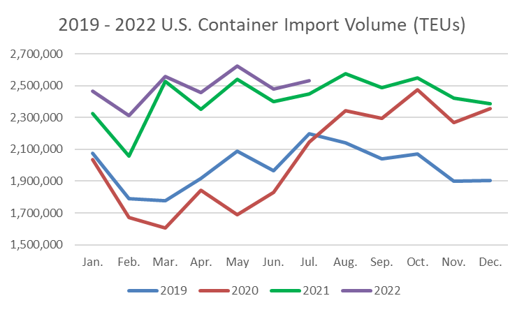 Container imports into the U.S. set another monthly record (see Figure 1), as TEU volume was up 3% from July 2021 to 2,530,906 and up 15% from pre-pandemic July 2019. Every month in 2022 has been a record month when compared to previous years. In July, container import volume reversed its June decline and was up 2% versus July 2021.