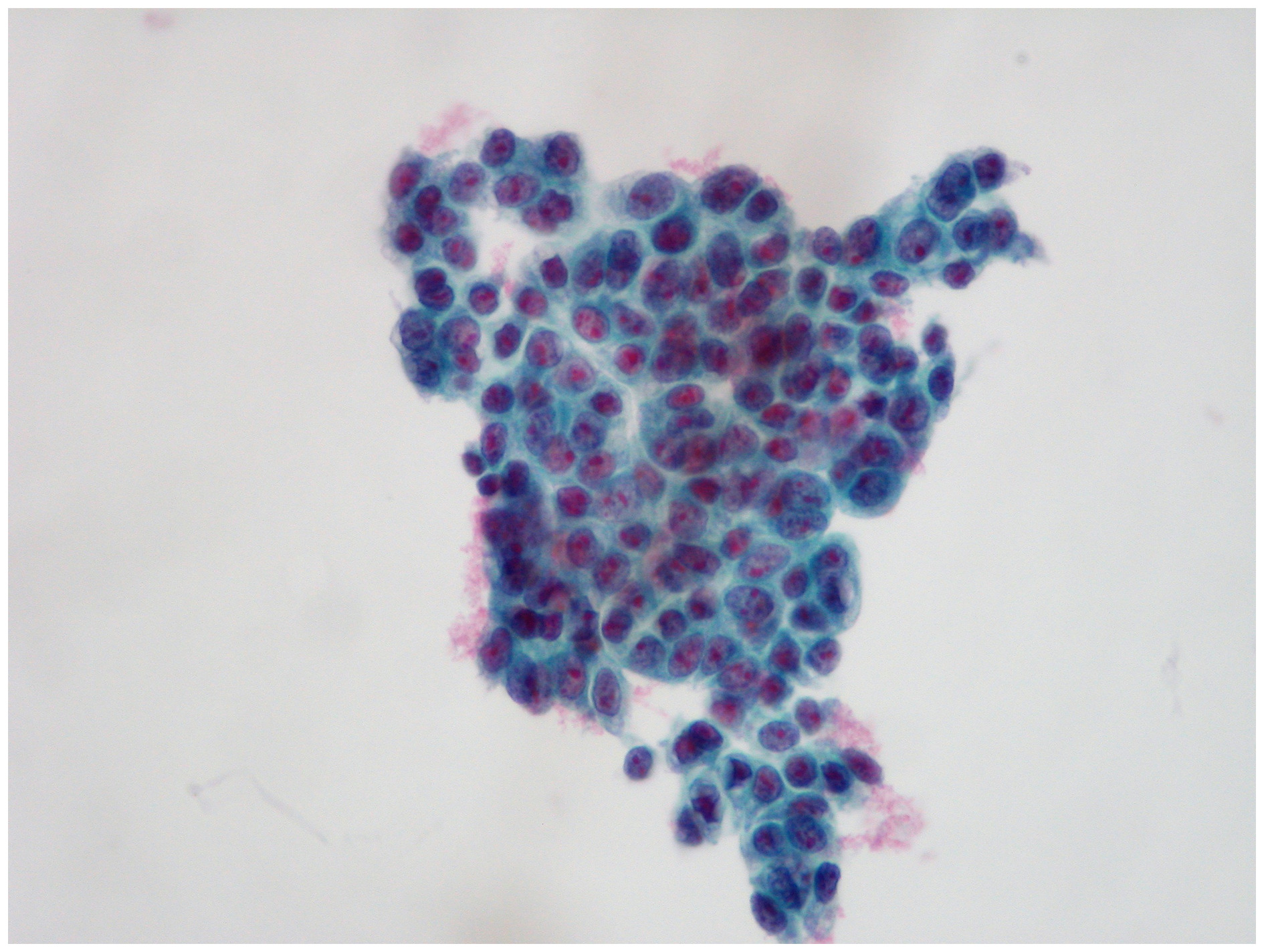 Cluster of neoplastic cells from a lung adenocarcinoma (ThinPrep, Papanicolaou, ×500).