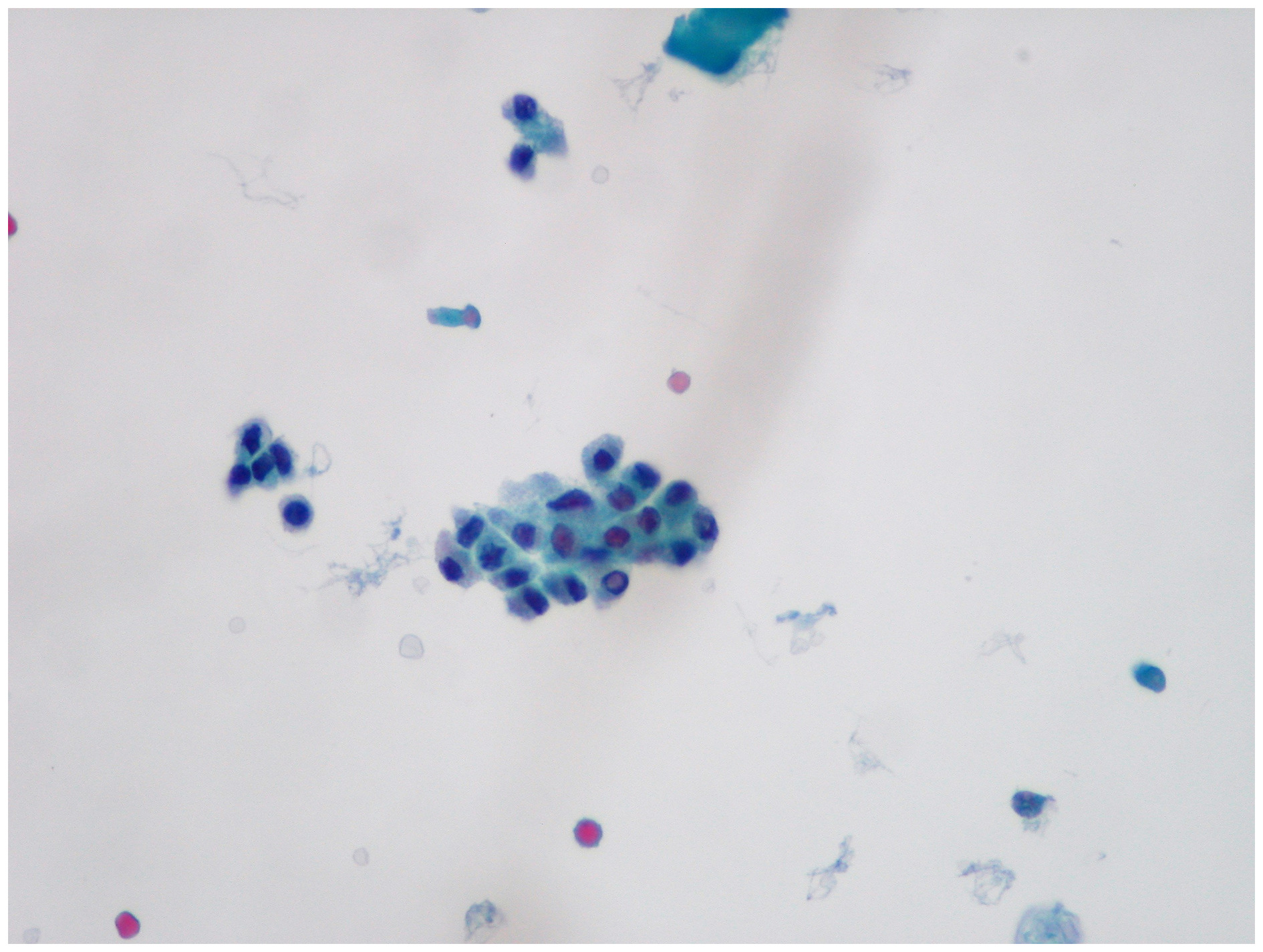 Clusters of neoplastic follicular cells of a papillary thyroid carcinoma (ThinPrep, Papanicolaou, ×400).