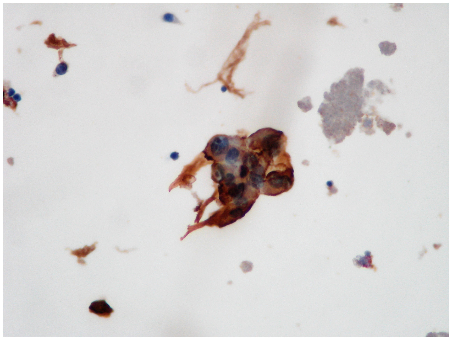 Group of neoplastic cells from a nodal metastasis of oropharyngeal carcinoma showing strong positivity for pancytokeratins (Avidin Biotin Complex, ThinPrep, ×500).