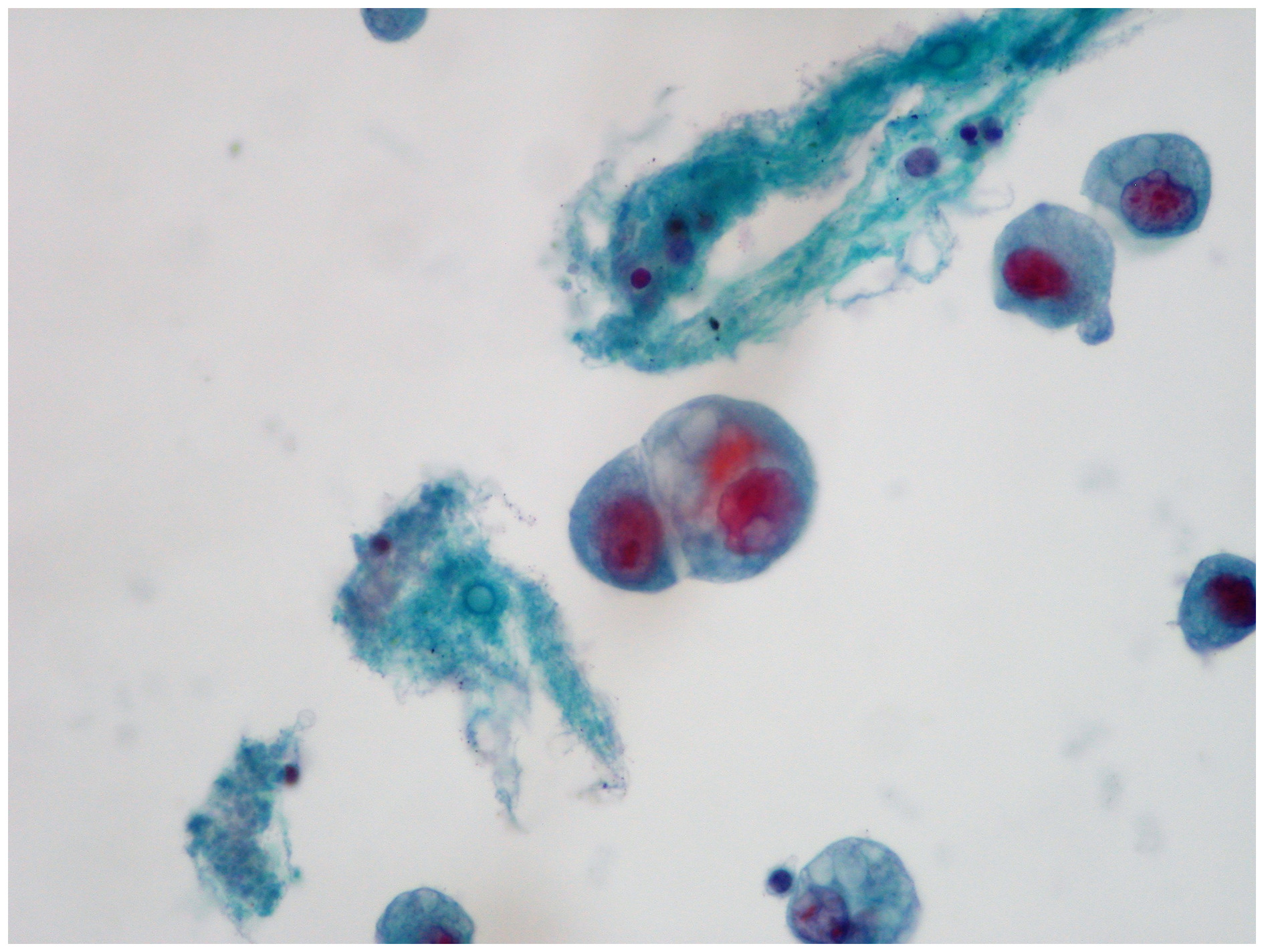 Urothelial cells suspicious for high grade urothelial carcinoma (SHGUC) (ThinPrep, Papanicolaou, ×500).