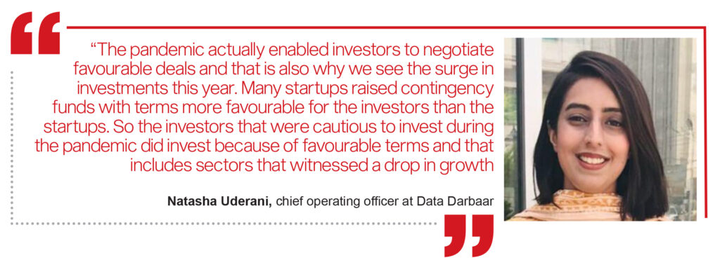 “The pandemic actually enabled investors to negotiate favourable deals and that is also why we see the surge in investments this year,” says Natasha Uderani, chief operating officer at startup insights company Data Darbaar. “Many startups raised contingency funds with terms more favourable for the investors than the startups. So the investors that were cautious to invest during the pandemic did invest because of favourable terms and that includes sectors that witnessed a drop in growth.”