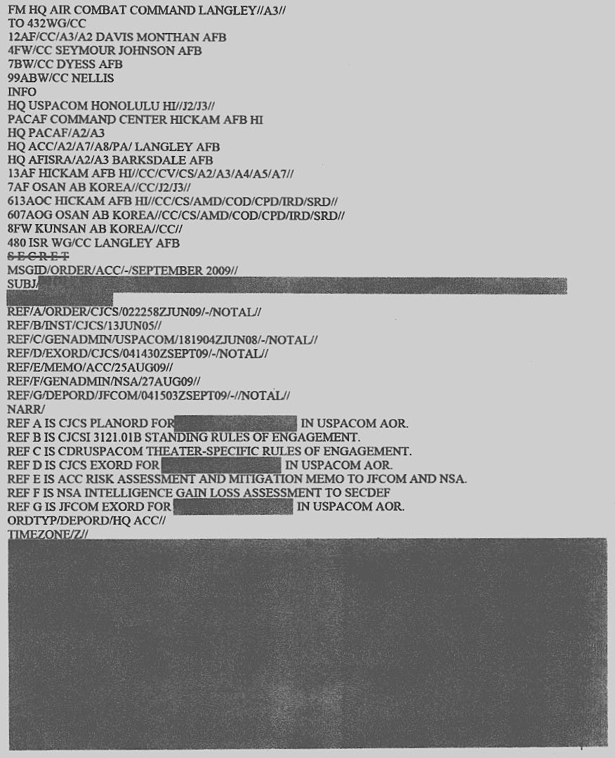 The first page of Air Combat Command’s order regarding the deployment of the RQ-170s to South Korea in 2009.