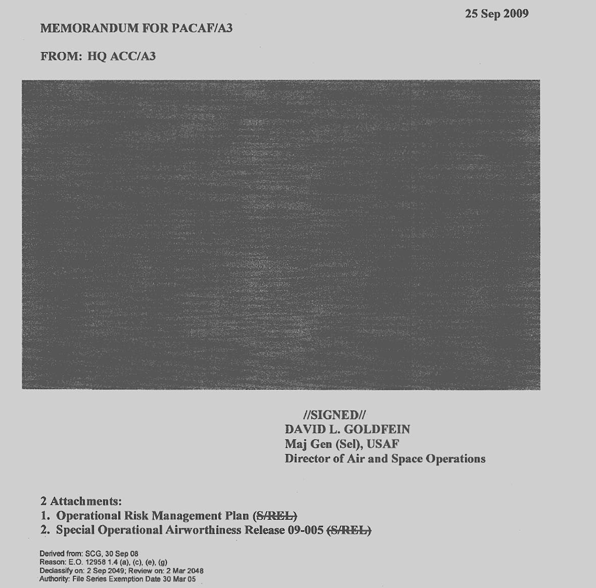 We do know that the National Security Agency (NSA), as well as Air Combat Command itself, did produce risk assessments regarding the proposed missions in East Asia after Chairman of the Joint Chiefs of Staff’s office issued the planning order. The Air Force completely redacted or otherwise withheld details about these reviews – including a memorandum from then-Major General David Goldfein, who was Air Combat Command’s Director of Air and Space Operations at the time – and a “special operational airworthiness release” for the RQ-170.