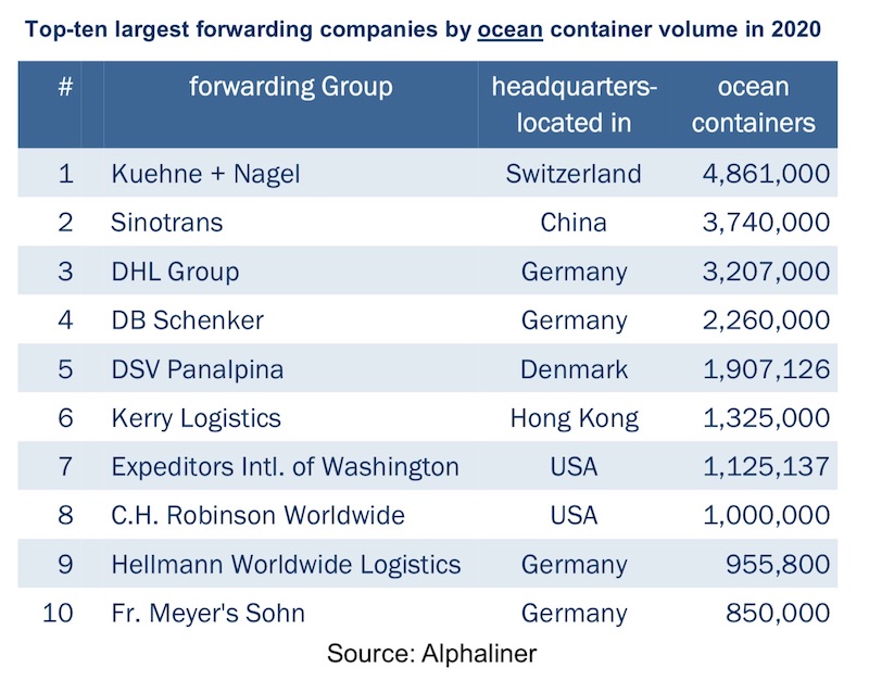 The additional 500,000 teu would put DHL on a par with Sinotrans near the top of the leaderboard among freight forwarders in terms of ocean volumes, according to data carried below from Alphaliner.
