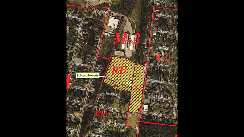 Goodman received council approval two years ago for rezoning of three properties totaling 7.88 acres on Factory Street — two of them, at 4.66 acres, from heavy industrial to residential urban, and the other property, closest to Factory Street itself, from heavy industrial to general commercial zoning. The properties are about two-thirds of a mile south of downtown and four blocks south of the Birdsong Peanut Factory.