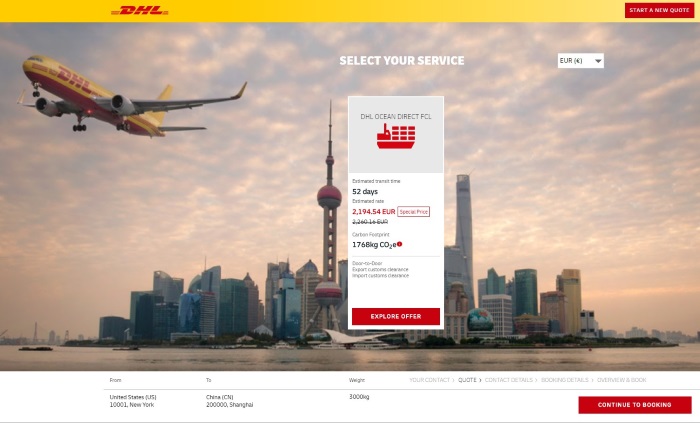 DHL Global Forwarding, the air and ocean freight specialist of Deutsche Post DHL Group, has expanded its instant online quotation and booking service to DHL Ocean Direct FCL (full-container-load). The service myDHLi Quote + Book makes instant bookings for air and ocean freight as well as door-to-door shipments available 24 hours a day, 7 days a week. It enables customers to compare available options and directly book the best mode of transport, speed and rate. When booking a service, users can also choose a cargo insurance for their shipment and reduce their CO2 impact by selecting an alternative fuel or an offsetting option in just a few clicks. myDHLi Quote + Book is available in more than 70 countries at https://quote.mydhli.com. Until now, this service was already available for DHL Ocean Connect LCL (less-than-container-load), DHL Air Connect, and DHL Air Economy.