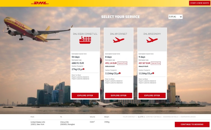 With a highly intuitive user interface, myDHLi Quote + Book allows instant access to air and ocean freight quotes based on minimal information. Thanks to these transparent quotes, customers can compare rates and lead times to select the best option for their needs. The integrated CO2 Calculator automatically displays the carbon footprint for the shipment in comparison between air and ocean freight where available. Furthermore, customers can save quotes and share them with selected recipients via e-mail or directly continue to booking. Quotes are valid for up to 30 days and can be accessed for booking at a later stage during this time. Customers can also easily choose to neutralize the carbon emissions of their shipments. In the next step, shippers can either choose a clean-burning fuel for ocean freight or an offsetting option for any transport mode.