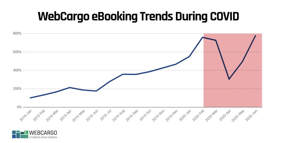 Statistics from WebCargo show that e-booking was increasing at a rate of more than 700% year on year in February and March before dropping back to between 300% and 500% in April and May.