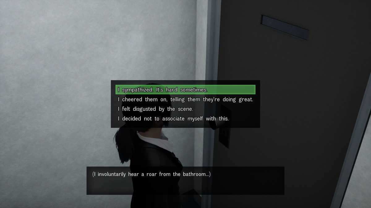 You go back to the stock room, where you find an injured man on the floor pleading for water. Despite there being several bottles of water in the store refrigerators, you can’t just give him some; instead, the shop worker from before gives you a store uniform so you can wear it and serve the angry customers. (You can overcharge them and pocket the cash, earning yourself an “Immoral Point.”) Only then will he tell you where the toilet paper is in the stock room, and only then can you give it to the guy in the bathroom — who turns out to be the store manager, sort of (that’s another story) — and only then can you buy water from him and give it to his own employee. For 10 “Moral Points.”