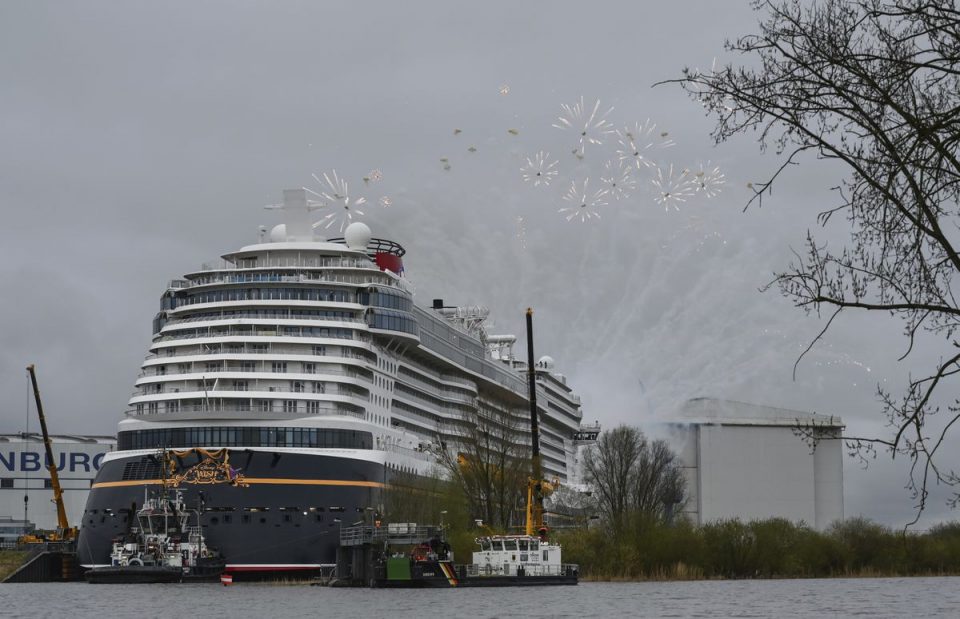 The newly built cruise ship “Disney Wish” of the Meyer shipyard in Papenburg, Germany, leaves the shipyard with the help of tugs to make its way to the North Sea on Wednesday. Fireworks will be set off on the way, (Lars Klemmer/dpa via AP) (Lars Klemmer/AP)