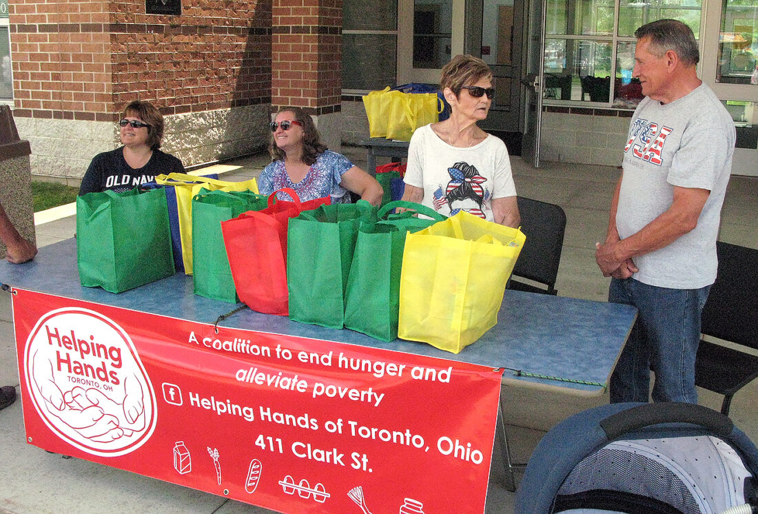 Volunteers with the Helping Hands Food Pantry distributed bags of food to families attending Toronto’s Safety Day held July 3 outside Toronto High School. Manning the charity’s table were, from left, Maureen Taggart, Amy Stimpert, Virginia Stimpert, its director, and Bob Bertram.