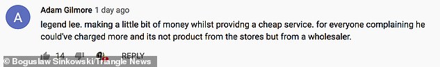 Adam Gilmore wrote: ‘Legend Lee. Making a little bit of money whilst providing a cheap service. For everyone complaining he could’ve charged more and it’s not a product from the stores but from a wholesaler.