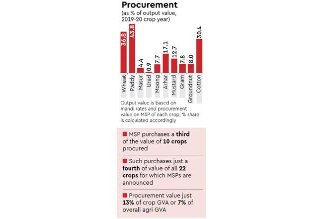 Even in case of the 10 crops that were actually procured by the government in 2019-20, the purchases made up for just about 33% of their total market value.