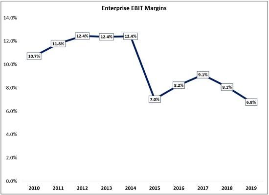 We can see the combined impact of margin contraction at both banners and mix shift to Family Dollar (which has much lower gross and operating margins than Dollar Tree) by looking at the consolidated margins for the company. As shown below, 2019 operating margins are now 500 to 600 basis points lower than what the company reported prior to the Family Dollar deal.